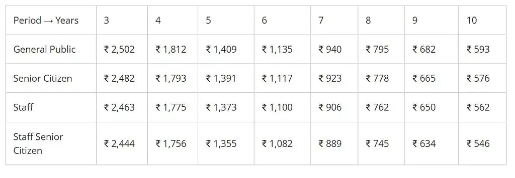 மேலே கொடுக்கப்பட்டுள்ள அட்டவணை ரூ.1 லட்ச திட்டத்திற்கான கணக்கு. ரூ.1 லட்சத்திற்கு மேல் வேண்டுமானால் மாதக் கட்டணத் தொகைகள் அதற்கேற்ப மாறுபடும்.