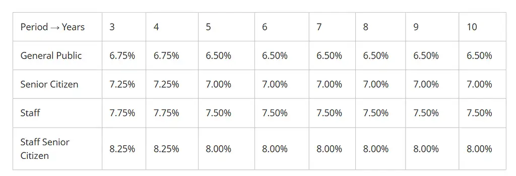 60 வயதிற்கு கீழ் உள்ளவர்களுக்கு 6.75 சதவிகிதம் வட்டி கிடைக்கும்; 60 வயதுக்கு மேல் உள்ளவர்களுக்கு 7 சதவிகிதம் வட்டி கிடைக்கும்.